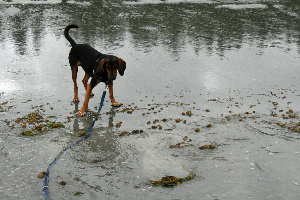 Instead it was time to take a walk along the beach. This beach actually had sand. That was after you crunched through the clam shells though. I enjoyed the beach and sniffed seaweed. The tide was coming in so I steered clear of the water. I don't like water that moves toward me and threatens me. We had a great time playing on the beach but, soon it was time to return.